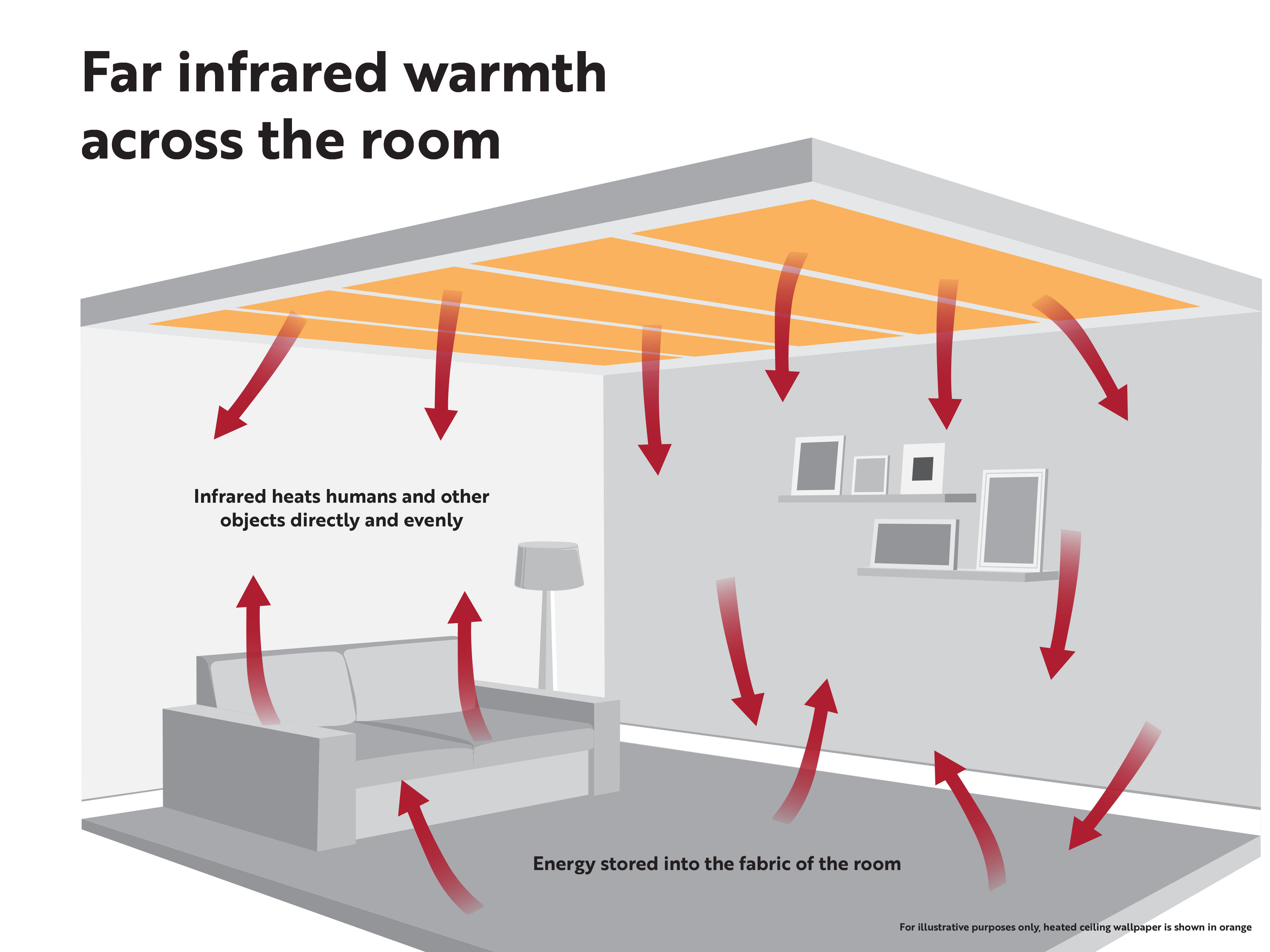 Infrared energy is different from traditional convective heating systems. Primarily, infrared passes straight through the air, heating humans and other objects directly (rather than via warming the air) so it’s effective in heating people even in hard-to-heat properties.