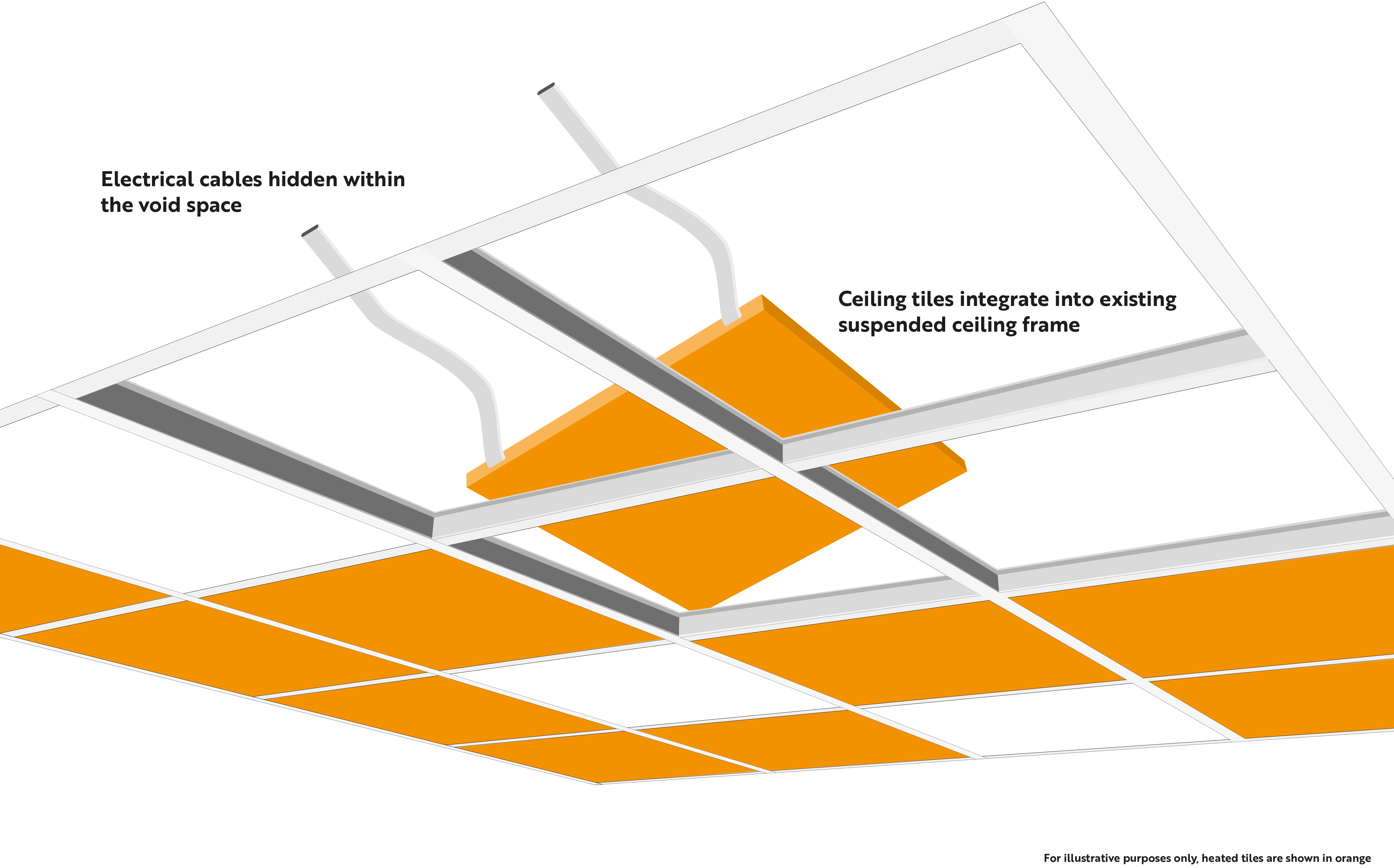 NexGen ceiling tiles drop into standard suspended ceiling grids to produce comfortable infrared heating in a very local area. The system is highly efficient in providing low carbon heating in large open-plan areas, also allowing targeted heating in areas with variable occupancy levels.