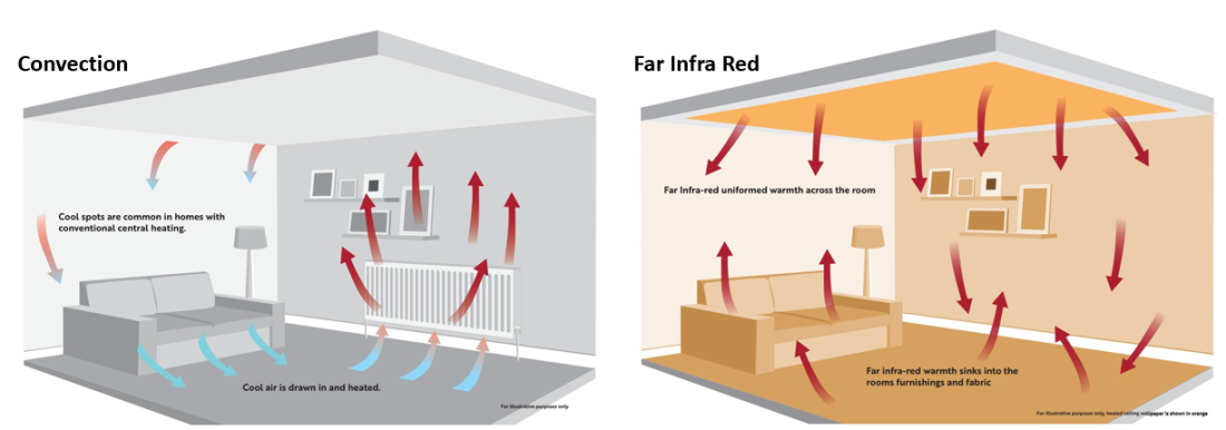 NexGen far infra-red ceiling paper and suspended ceiling tiles, work on the physics of Operative Temperature and storing thermal mass in building fabric – conventional convection-heating, radiators or hot air ducted heat, mobilizes energy in air, and hot air simply rises until it cools – NexGen Far Infra-Red energy emits at the same wavelength as sunlight, universally heating all surfaces, creating stored thermal mass – and we directly heat people in their homes – in your next-gen home or office of the future, retrofit or new built. We will be heating people first, storing energy thermo-dynamically, minimize movement of air, and significantly lower thermal losses.